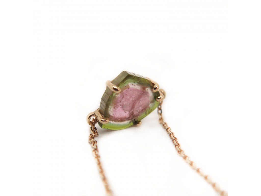 Prsten s přírodním melounovým turmalínem. Červené zlato, všechna zlata jsou ve kvalitě 14k 585/1000, váha šperku cca 2,30g. délka řetízku 50cm a druhé očko 53cm.